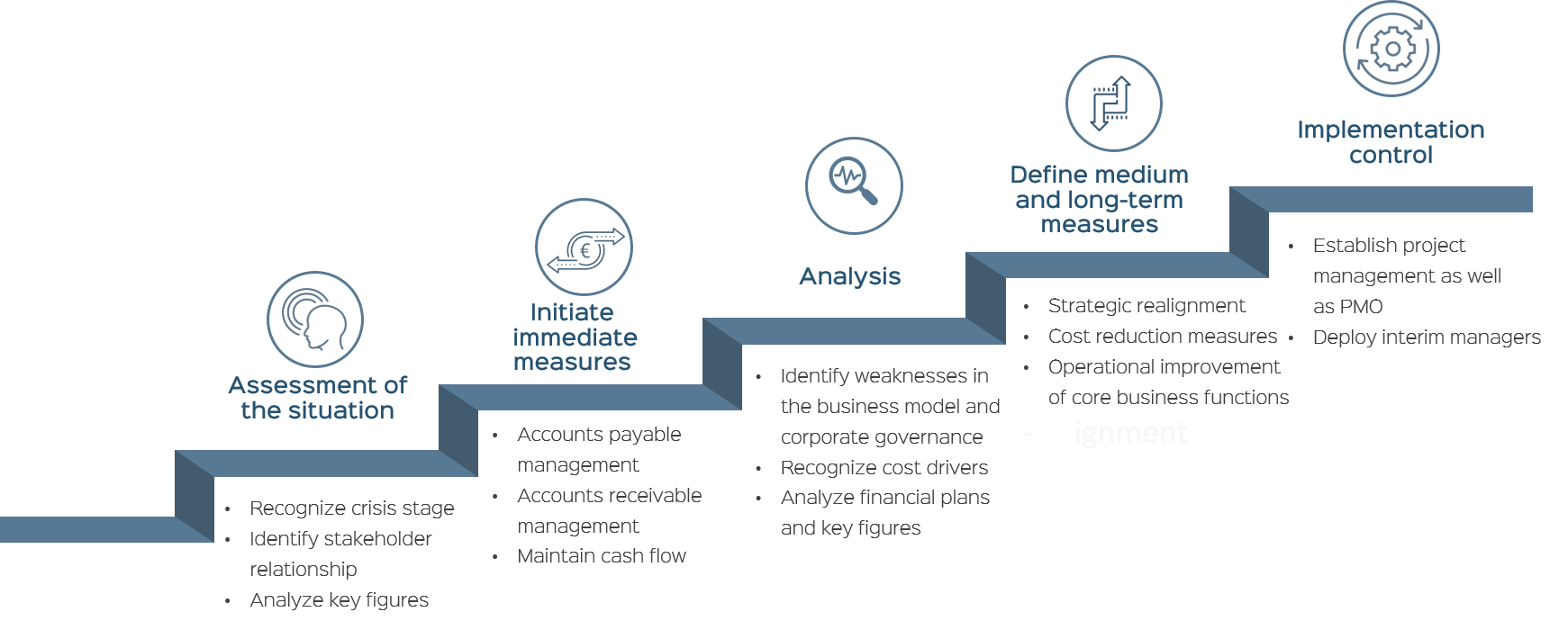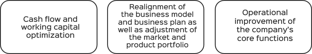 With over 20 years of industry experience, a holistic and implementation-oriented approach as well as a hands-on mentality, we support you in the restructuring and turnaround of your company with the following measures: